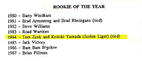 By the end of 1984 people were beginning to take serious notice of Tom Zenk's ring work. Dave Meltzer's Wrestling Observer Newsletter recognized Zenk's talent early, jointly awarding both Zenk and Keiichi Yamada (Jushin "Thunder" Liger of New Japan Pro Wrestling) the 1984 "Rookie of the Year" Award. The AWA responded, awarding Zenk the title of most improved wrestler in the promotion. Meanwhile a wrestling newsletter of the time (August 1984) speculated that "as Steve Regal moves on (possibly before year's end) Zenk will be the new AWA light heavyweight champ."