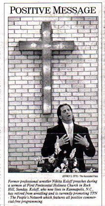 Later Koloff underwent religious conversion. As his biography notes - " As much as the rejoicing of fans raised the roof the night that Nikita came to Dusty's aid against the Horsemen, the response pales in comparison to the rejoicing of the angels in Heaven the day that Nikita bowed a knee at the altar of Salvation..."