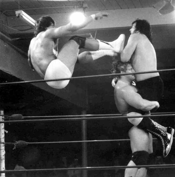 | HITTING THE HEIGHTS - and the lights - Zenk flies over Doring's head to deliver a drop kick (from a standing position) to 'Mean' Mike Miller. Don Coss referred to it as the "Sky-High Drop-kick." Sandy Barr (former wrestler, PNW referee, father of Jesse and Art Barr) called it the highest drop kick he'd seen in the business. |