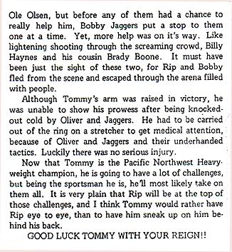 In Montreal, the bigger pay day and the tag opportunities Martel promised never eventuated - but by the time Zenk realized this, it was already too late and too expensive to go back.His departure from Portland hadn't been acrimonious. When he gave Don his five weeks notice, Owen had offered an extra $1,000 to stay. Don accepted the inevitable with one regret - "Tom, we never got you beat!" They were disappointed and their feelings hurt - but the Owens always acted with great generosity.