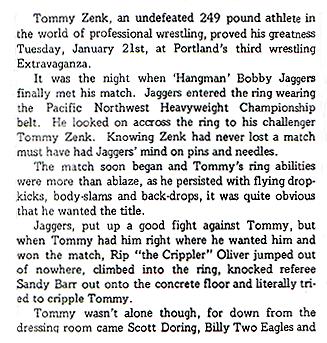 It was something Zenk tried to repay in a small way later, when he returned Portland in February 1988 to support Don Owen on the night Billy Jack Haynes' opened his rival Oregon Wrestling Federation.