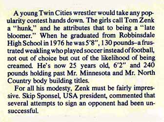 The AWA schools of the time, as described by former champion and AWA promoter Verne Gagne, were "no different than going to college or going to a trade school. There's tuition, and you pay the tuition and you pay half of it up front. And then at the end of the four week period, if we don't think you have a future, we don't encourage you to go on. A lot drop out on their own. It's not what you thought it was. It's too hard" (Interview, Inside Wrestling, October 1986; 40). Tom survived the tuition.