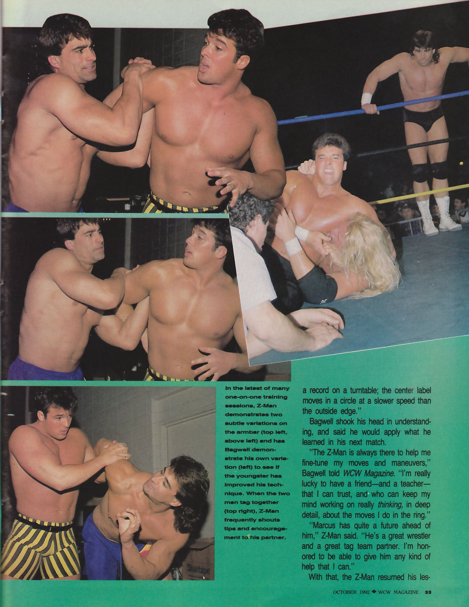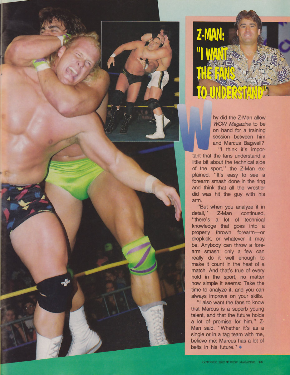 WCW Magazine, October 1992 When Z-Man took Marcus Alexander Bagwell under his wing, the rookie sensation gained a valuable and experienced mentor. In this fascinating feature, WCW Magazine gives you a rare glimpse at the fine-tuning of a future champion. by Craig Peters