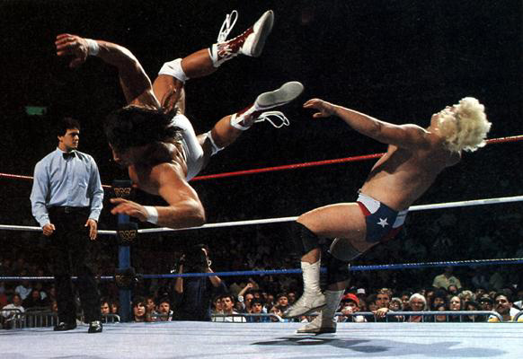 Can-Ams: Martel and Zenk may be a new team, but their forte is aerial maneuvers. Martel's over-the-top-rope vault served him well as AWA World chamopion: the added force of Zenk slingshotting him off the ropes provides added authority to the move. Zenk possesses one of the top three best dropkicks in the sport today, and he will only get better in the months to come. But the fact remains: They are a new team, and a lot of their two-man finishing moves still need to be polished. Rating: 8.0