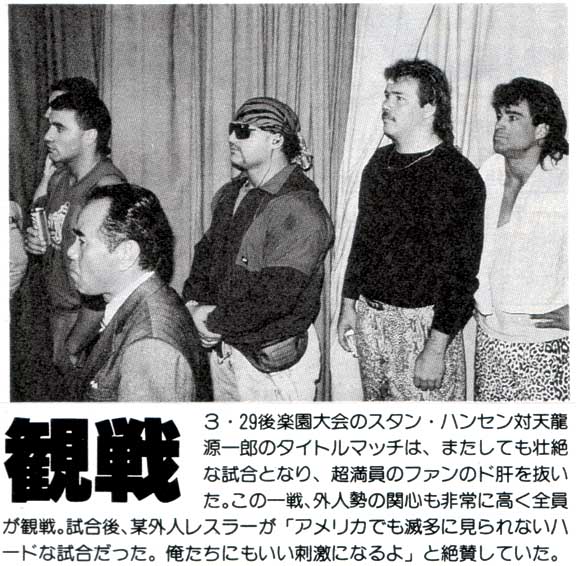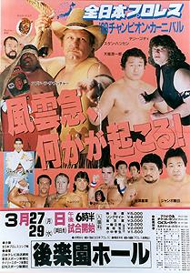 Genichiro Tenryu, Toshiaki Kawada and Samson Fuyuki over Tom Zenk, Dan Kroffat (Phil LaFon) and Doug Furnas in 14:00 when Tenryu pinned Kroffat with the powerbomb (images). |
