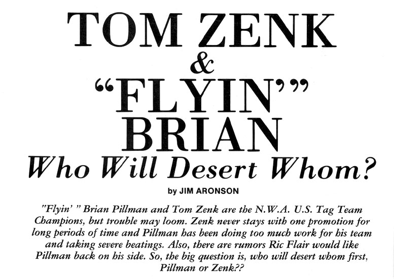 Background to the story - "A few months earlier the booking committee had decided it was time to finish off Ole’s ring career. Someone in the North Tower had told them “Get that old fucker off TV.” To show everyone Ole was past his prime, The Freebirds blew him up in a match in Dayton, Ohio. The old wind bag gassed in record time but they kept him in the ring, happy to settle an old score. The plan was for Ole to be pensioned off in an 'I Quit" match with Scott Steiner. The match never took place. Instead, Herd appointed Anderson WCW chief booker. Ole was back and bitter and according to Meltzer gunning for WCW's "stable of experienced top quality workers." Meltzer warned, with uncanny accuracy, "Expect .... Tom Zenk to be putting guys over with Anderson as booker." And what exactly had I done wrong?Ole was a former Atlanta NWA promoter and charter member of the “Fuck the young guys. We never got guaranteed contracts. We never got money like that” brigade. With contracts in every guy’s pocket, Ole could no longer maneuver the boys the way he used to in the good old days. With a two-year contract and guaranteed money, our loyalty was to Uncle Ted. As far as the boys were concerned, we owed Ole nothing. Any respect he wanted, he’d have to earn like any one else. So killing off guaranteed contracts became Ole’s mission. And I became public enemy number one....Two weeks later, Meltzer confirmed “It appears both Brian Pillman and Tom Zenk are going to be phased down and out respectively."