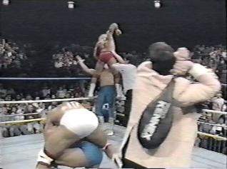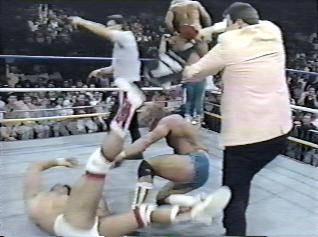 W and retain titles | Match lasted 23.40 "the match was way too long. Zenk and Pillman tried and didn't look bad, but the match was bad. Garvin was just awful. The NWA has just a few weeks to decide whether or not to allow his contract to extend for another year and if there is anything on the borderline he did a great job in hurting his own case. Finish was booked well but looked pretty sloppy in execution. Pillman pinned Garvin with a flying body press during a four way." Half a *" DM 3/5/90 |