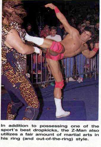 WCW Magazine: Have you ever pictured yourself as part of that Saturday Night Live skit: "The Z-Man, the Z-meister general, the big Z, throwing some drop-kicks..."? Z-Man: You know, I get that sometimes from people, that thing you're talking about, just like that. Gee, I hate that guy! That routine got real old real fast, didn't it? WCW