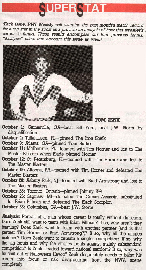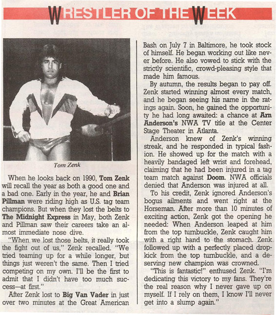 Tom Zenk's Match Record - every match in every federation (almost) As the following PWI Weekly extract from 1991 indicates, WCW booking of Tom Zenk was erratic to the point of misuse, a point reinforced by numerous commentators and by Zenk himself. The results from all Tom's ring matches from 1984 -1994 are set out below and speak for themselves.... |