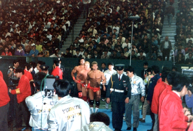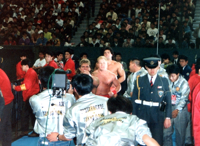 "A few hours before show time ...most of the Japanese wrestlers [were] doing either light weight work, jogging or ...squats.. A few Americans, most notably Brian Pillman, got in the ring to continually test the ropes. Some of the other WCW personnel, particularly Jim Ross, Rick Steiner and Tony Schavione were taking photos of the building like tourists. At about 1 p.m. they did a run through of the opening ceremony in which, on the giant screen, they would list the match and then have interviews and/or angles that set up the match. The sound system in the Dome is the best of any arena I've ever been in. Shortly after that, they opened the door to fans..... The show started at 3 p.m.. with about a ten minute long opening ceremony on the big screen. Ring announcer Hideki Tanaka would announce the match, which appeared on the big screen, and then one side or individual and then the other would do an interview. The interviews were done the previous morning at the hotel and most were done in American style. The fans laughed at the Japanese doing American interviews." (WON 04/01/91)