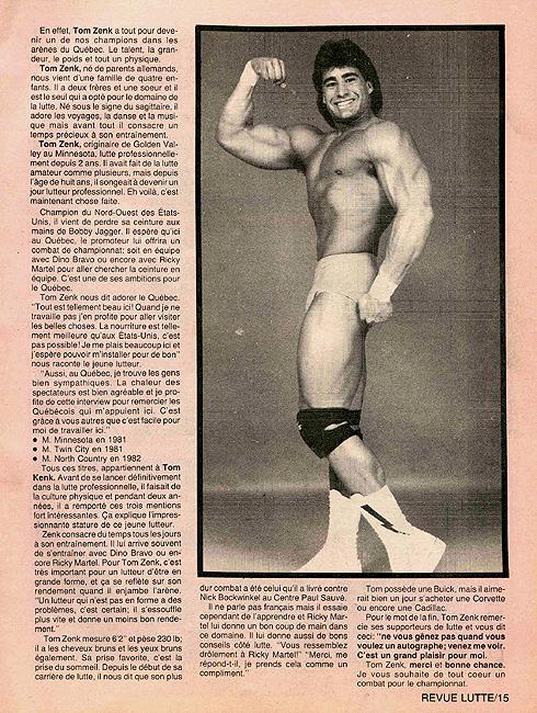 Formerly a United-States Northwest champion, Zenk has just lost the title to Bobby Jaggers. He hopes that here in Québec, the promoters will offer him a shot at a championship, maybe in tag team with Dino Bravo or Rick Martel. This is one of his ambitions for his Québec tour.